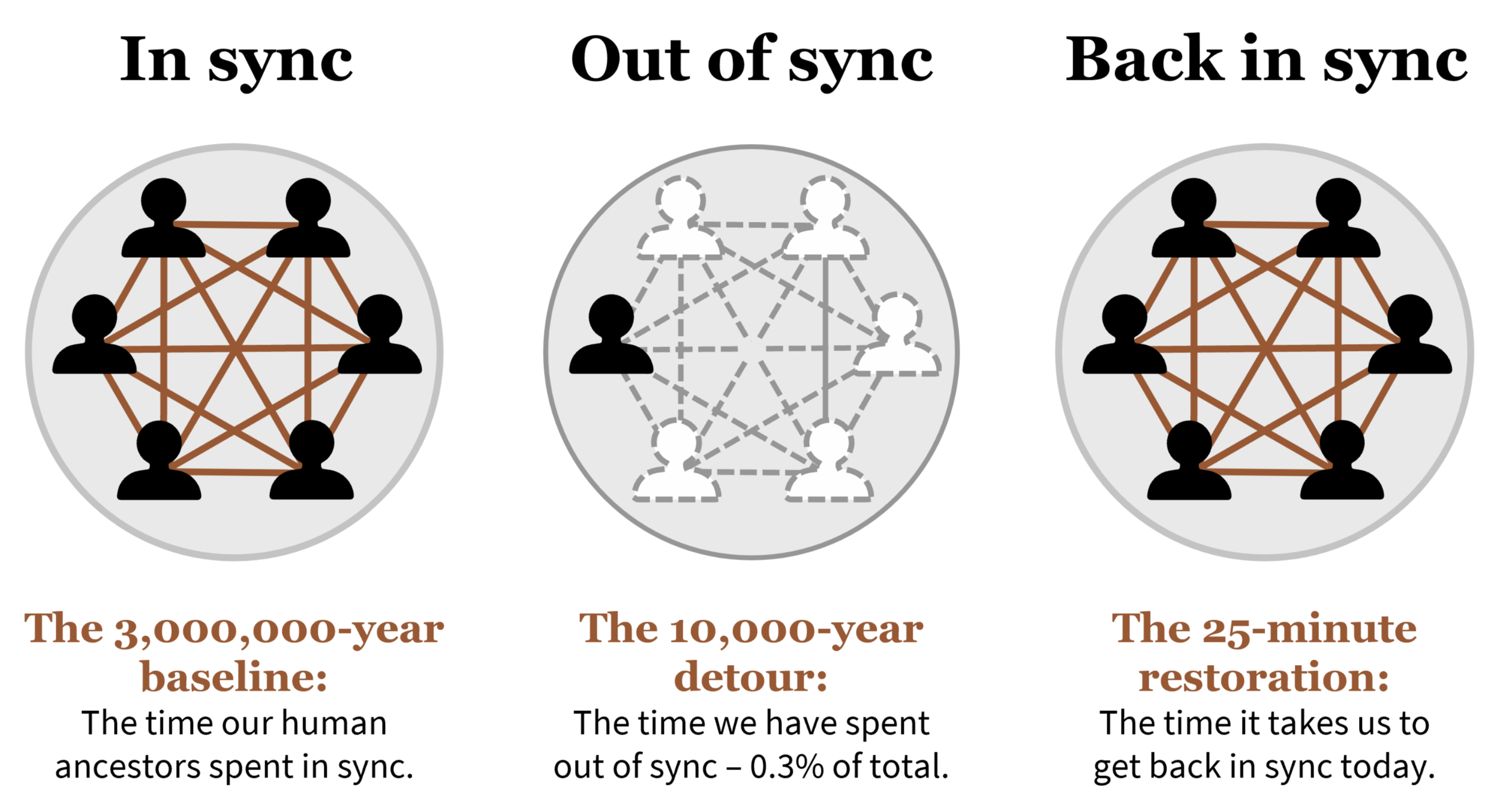 Modern neuroscience is unambiguous about what happens when nervous systems synchronize: stress hormones drop, heart rate variability improves, prefrontal access expands, and the group begins to think in ways that none of its members could manage individually. The group becomes more than the sum of its parts.